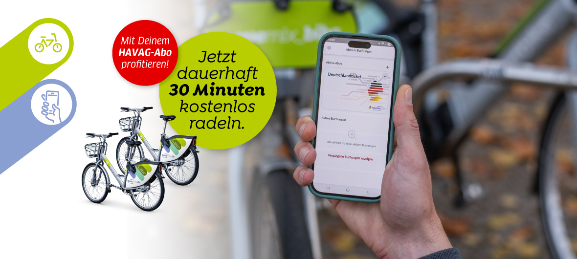 Alle, die ein Abonnement bei der HAVAG abgeschlossen haben und 18 Jahre alt sind, erhalten für die Vertragslaufzeit ihres Abonnements 30 Minuten Freifahrt je Ausleihe mit Standardrädern (keine E- oder Cargo-Bikes) mit einem movemix_bike. Ab der 31. Minute gilt der Basistarif.
