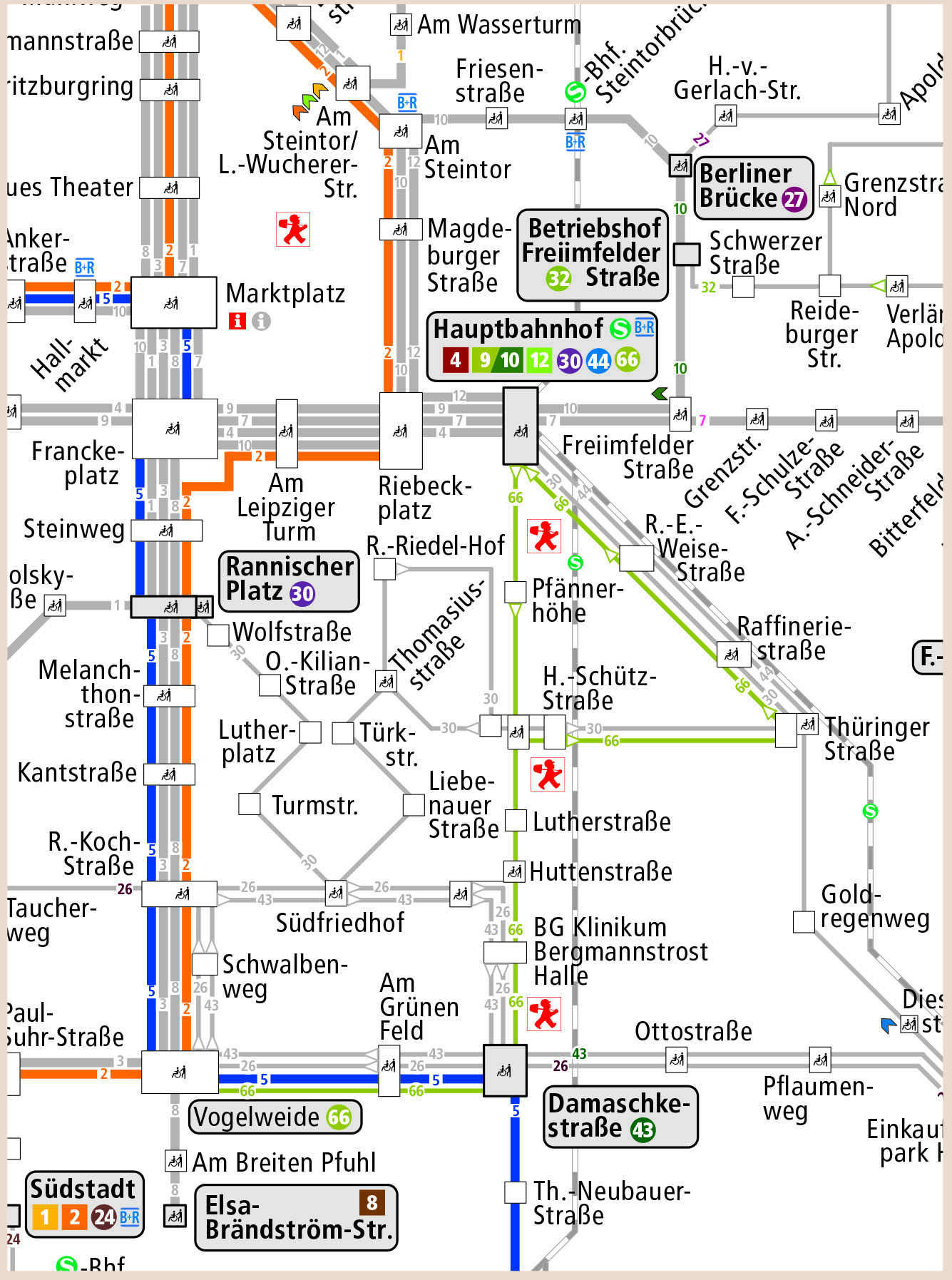 Die Linie 2 fährt von der Südstadt kommend ab Vogelweide über Rannischer Platz - Am Leipziger Turm - Riebeckplatz - Am Steintor - Reileck - Bernburger Straße zum Marktplatz und weiter regulär.