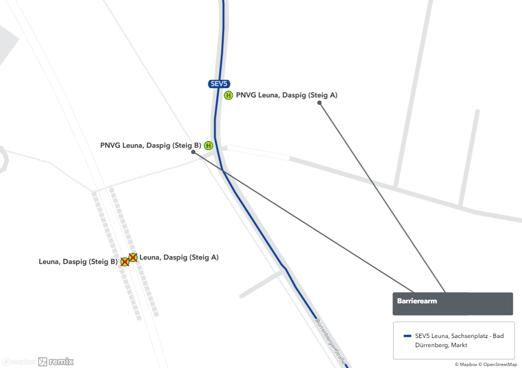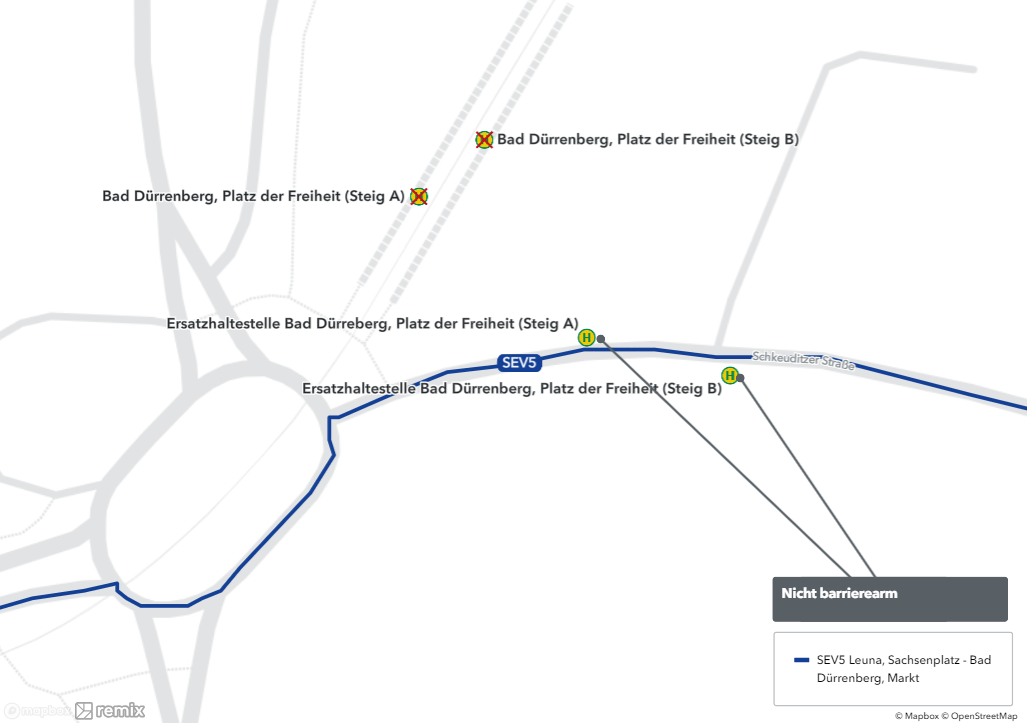 Während der Gleisbauarbeiten werden die Straßenbahnhaltestellen zwischen Leuna, Krähenberg und Bad Dürrenberg, Markt nicht angefahren. Diese Ersatzhaltestellen richtet die HAVAG ein: Leuna-Kröllwitz (Steig A und B), Kirchfährendorf (Steig A und B), Kurpark (Steig A und B), Platz der Freiheit (Steig A und B) sowie Bad Dürrenberg, Markt (Steig A). Der Bus SEV 5 bedient für die Haltestellen Krähenberg, Daspig und Bad Dürrenberg, Bahnhof die Haltestellen der PNVG. Zusätzlich wird die Haltestelle der PNVG Bad Dürrenberg, Markt bedient.