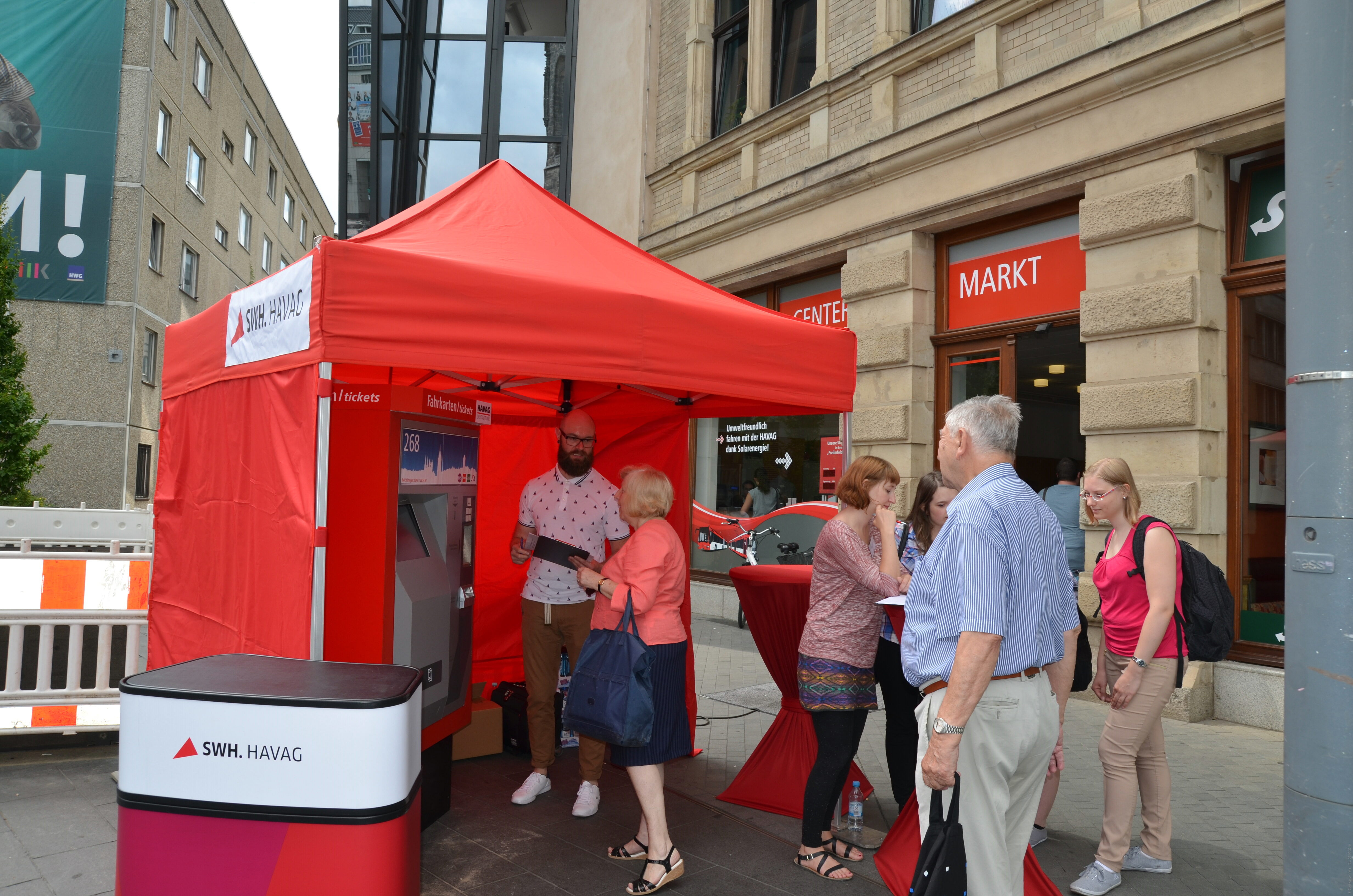 Bürger testeten neuen Fahrkartenautomaten (Dummy) vor dem HAVAG SERVICE CENTER auf dem Markt. Mitarbeiter der Firma Handspiel GmbH aus Leipzig erklärten die Oberfläche und sammmelten alle Anregungen der Bürger, um sie weiter zu verbessern.