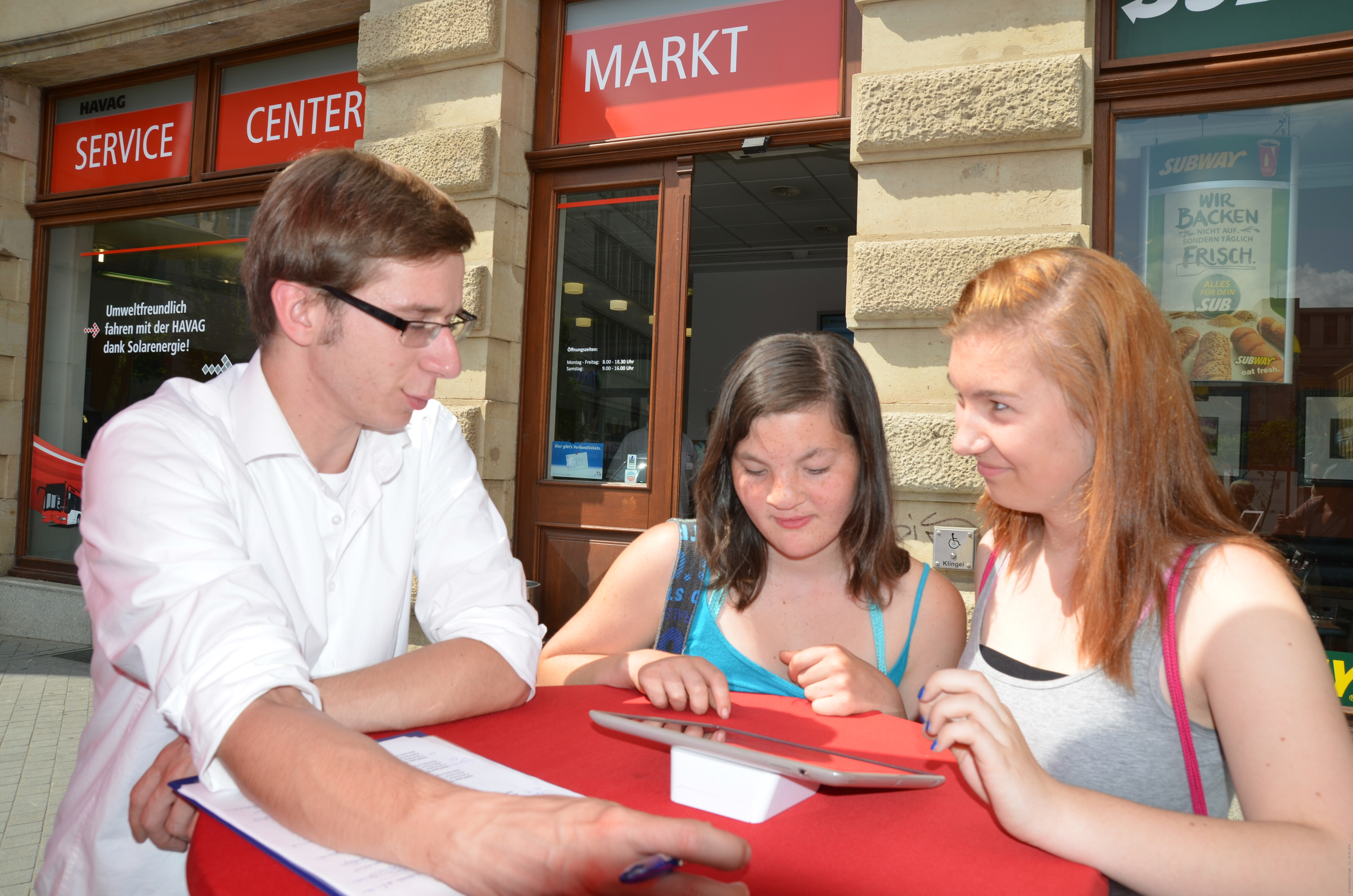 Bürger testeten neuen Fahrkartenautomaten (Dummy) vor dem HAVAG SERVICE CENTER auf dem Markt. Diane Guthke (re) und Madleen Kellner (mi) finden die neuen Automaten besser als die alten, weil die Benutzerführung viel übersichtlicher ist. Mitarbeiter der Firma Handspiel GmbH aus Leipzig erklärten die Oberfläche und sammmelten alle Anregungen der Bürger, um sie weiter zu verbessern.