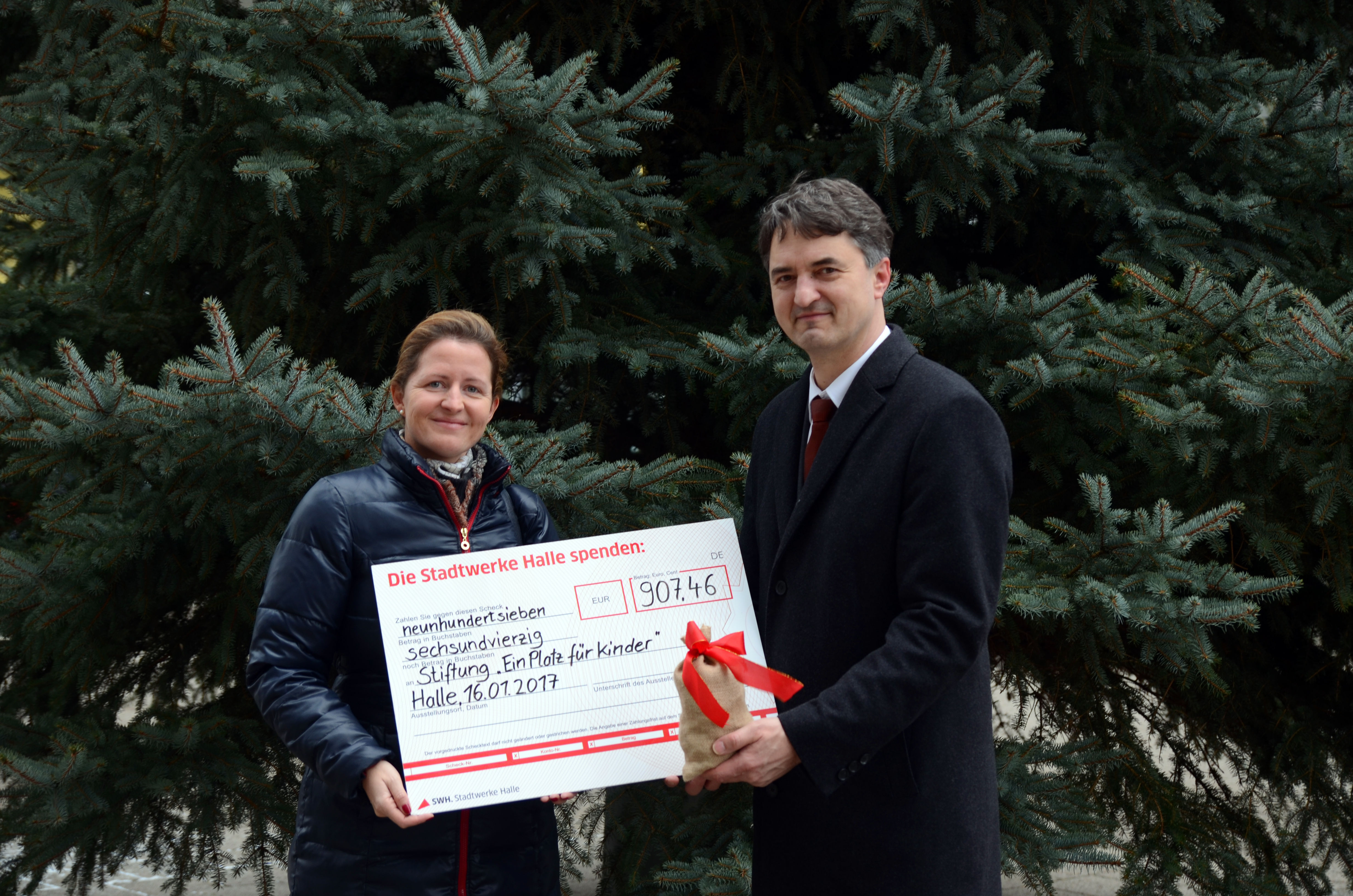 Heute überreichte Matthias Lux, Vorsitzender Geschäftsführer der Stadtwerke Halle GmbH, Johanna Ruoff, Vorstand der Stiftung „Ein Platz für Kinder“, die Spende seiner Mitarbeiter in Höhe von 907,46 Euro. „Derzeit haben wir zwei Schutzhäuser in Hamburg und Hannover. In diesem Jahr möchten wir ein weiteres Schutzhaus in Halle (Saale) bauen“, erklärt Johanna Ruoff, Gründerin und Vorstandvorsitzende der Stiftung. „Die Spende werden wir für die Innenausstattung eines Kinderzimmers im neuen Schutzhaus einsetzen.“