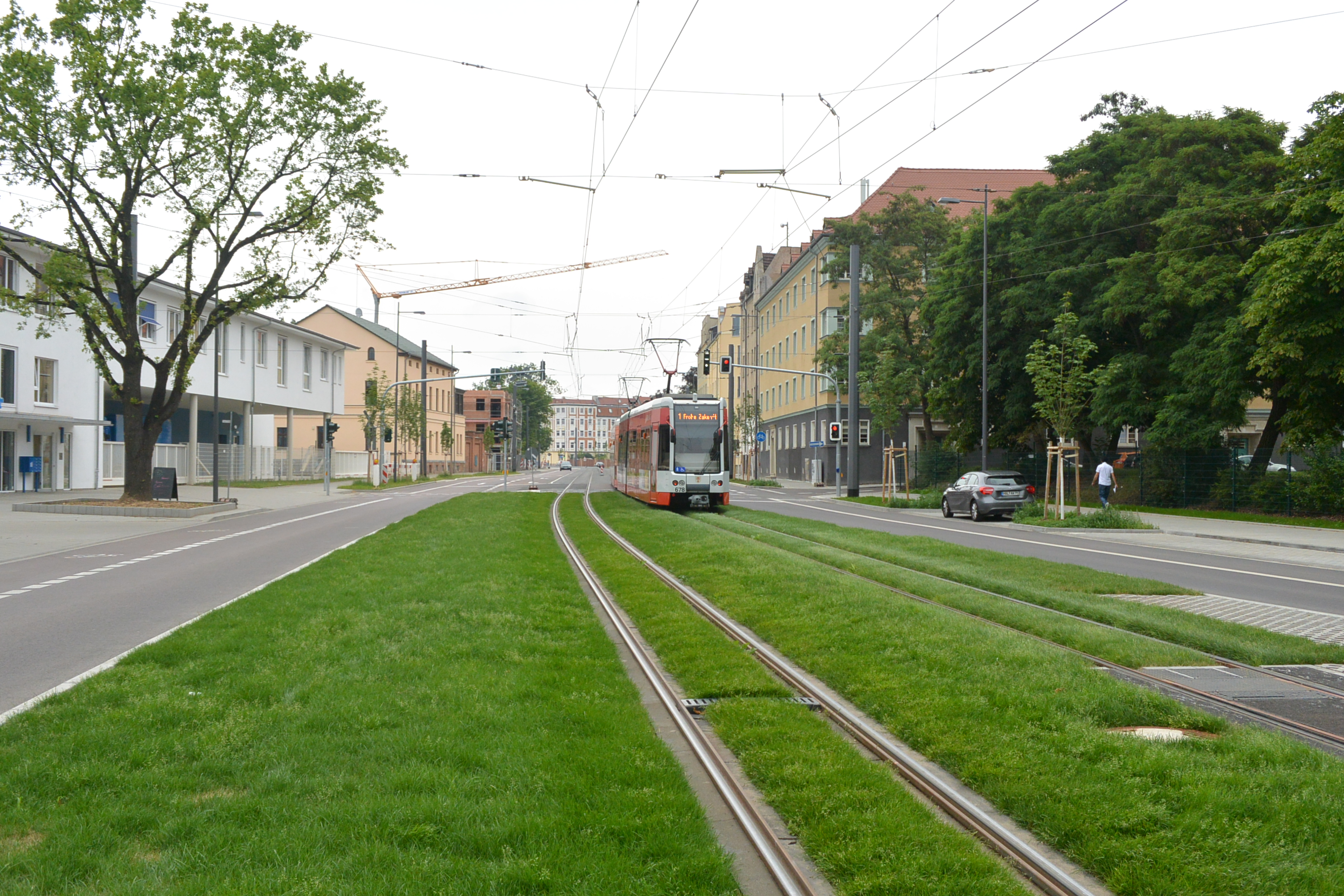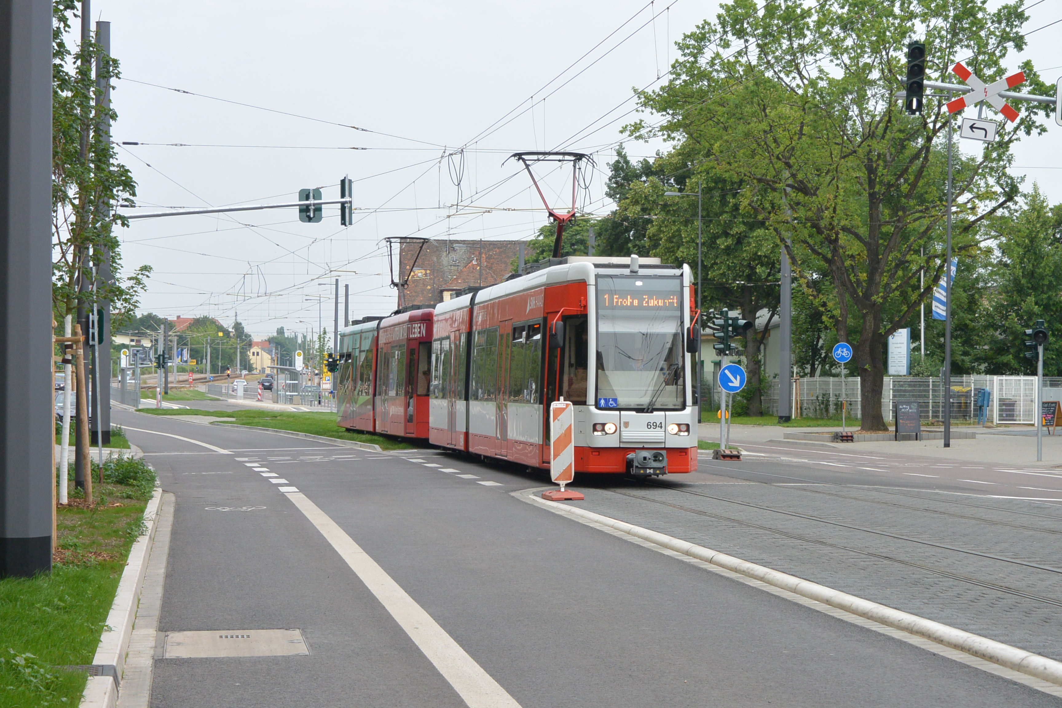 Halle (Saale), 26. Juni 2017 - am Freitag, 23. Juni, wurde der Böllberger Weg Nord, der im Rahmen des Programms STADTBAHN Halle ausgebaut wurde, planmäßig wieder für die Autofahrer freigegeben. Straßenbahnen rollen bereits seit Dezember 2016 über den neugestalteten Abschnitt. Zwischen Geseniusstraße und Straßenbahnschleife Böllberg ist nun alles schick, besonders ins Auge fällt das viele Grün zwischen den Gleisen, denn durch den Bau von Rasengleisen will die Hallesche Verkehrs-AG (HAVAG), ein Unternehmen der Stadtwerke Halle, zukünftig sowohl Schmutz als auch Lärm vermindern. Rasen und gepflanzte Bäume stehen nun unter ständiger Beobachtung, schließlich soll alles ordentlich anwachsen, die Abteilung Stadtgrün der Stadt Halle (Saale) kümmert sich um die Bewässerung. „Hoffen wir, dass in Zukunft das Grün dominiert“, sagt Gerd Blumenau, Prokurist der HAVAG.