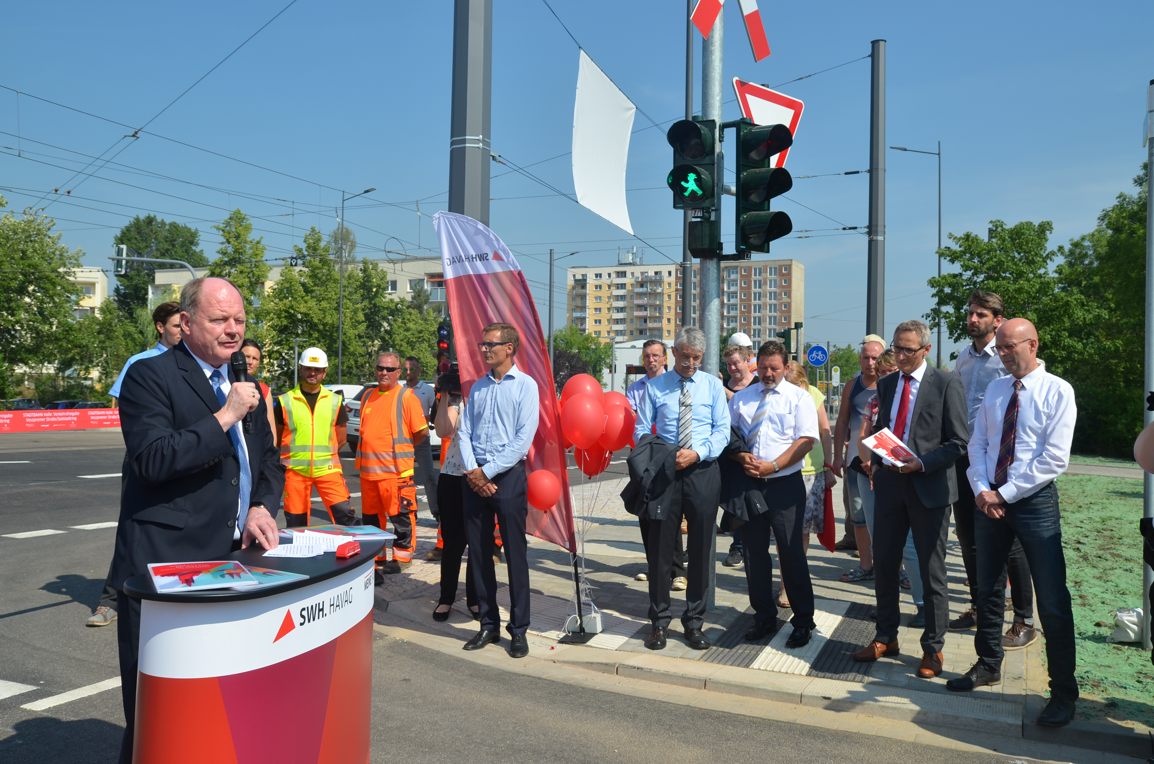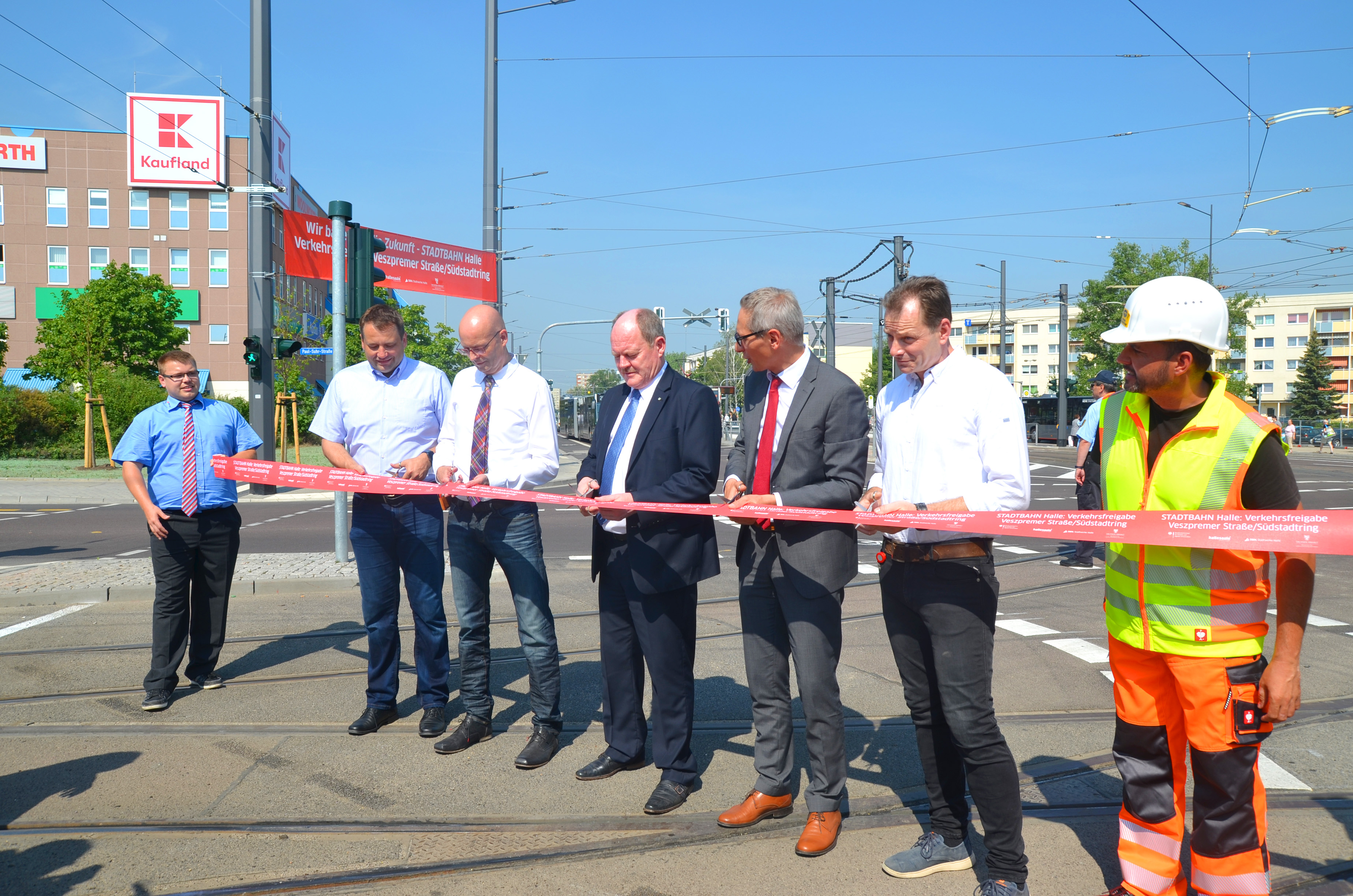 Die „neue Mitte des halleschen Südens“ an der Veszpremer Straße/Südstadtring wurde heute durch den Minister für Landesentwicklung und Verkehr des Landes Sachsen-Anhalt, Thomas Webel, und den Oberbürgermeister der Stadt Halle (Saale), Dr. Bernd Wiegand, als ein wichtiges Vorhaben des Programms STADTBAHN Halle offiziell eröffnet. Mit der Realisierung des neuen ÖPNV-Umsteigepunktes ist ein neues Zentrum des Stadtteils Südstadt entstanden. Das 20-Millionen-Teilprojekt des Programms STADTBAHN Halle wurde in kurzer Zeit von Oktober 2016 bis Mai 2018 realisiert. Alle beteiligten Firmen arbeiteten mit Hochdruck an der Umsetzung des ehrgeizigen Projektes.