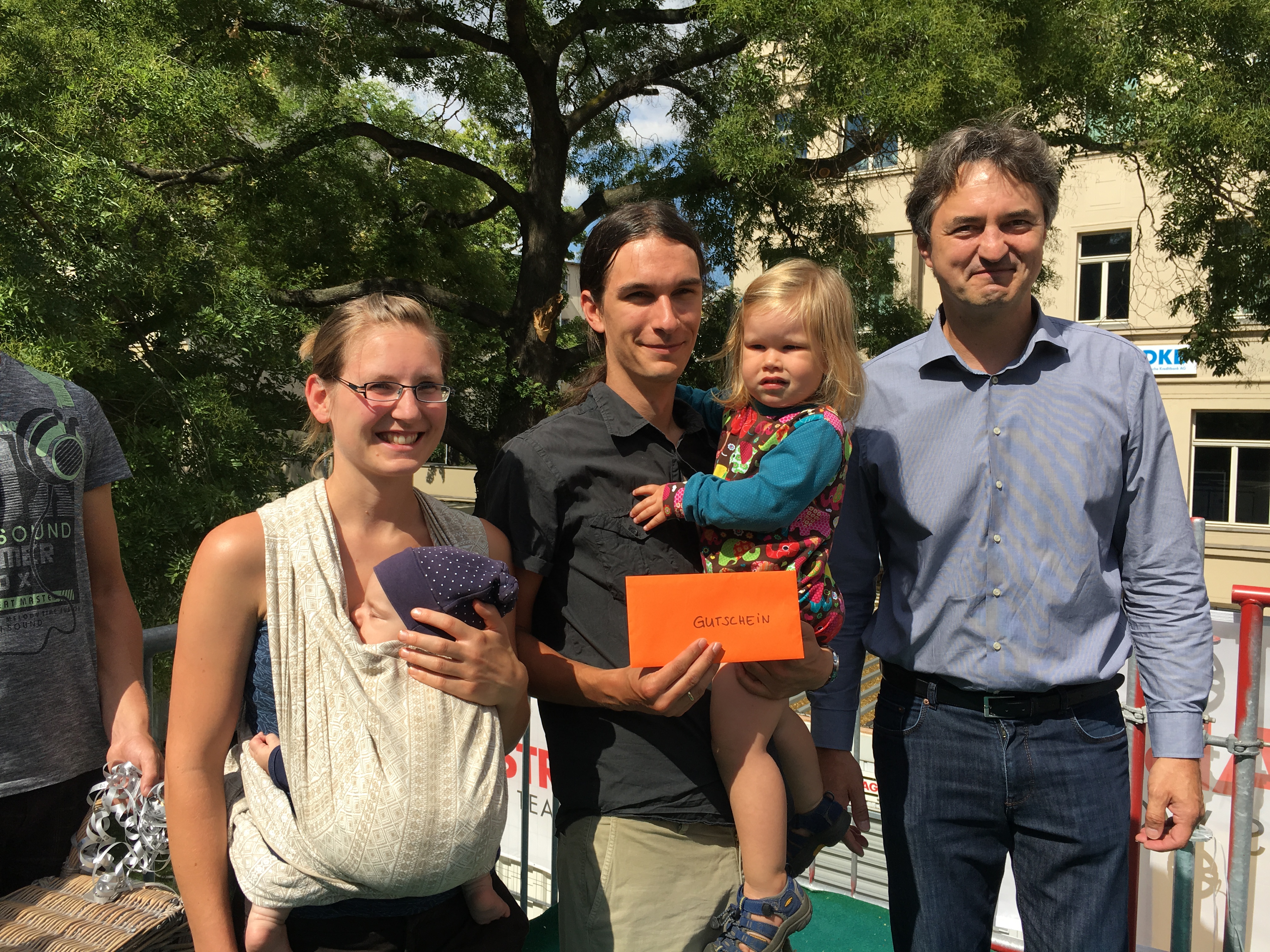 Heute überreichten Stadtwerke-Geschäftsführer Matthias Lux und Jan Röder, Vorstand der Volksbank AG, den fünf Preisträgern des Gewinnspiels zum Baustellenfest in der Großen Steinstraße ihre Gewinne. Das Fest hatten die Stadtwerke Halle gemeinsam mit der Volksbank AG und dem Zirkus Klatschmohn Anfang Juli mitten auf der Baustelle veranstaltet, der Zulauf war mit rund 1.500 Besuchern groß. Verlost wurden eine Heißluftballonfahrt, ein HAVAG-Jahresabo, 5 Gramm Gold, ein Maya mare-Gutschein und ein Picknickkorb.