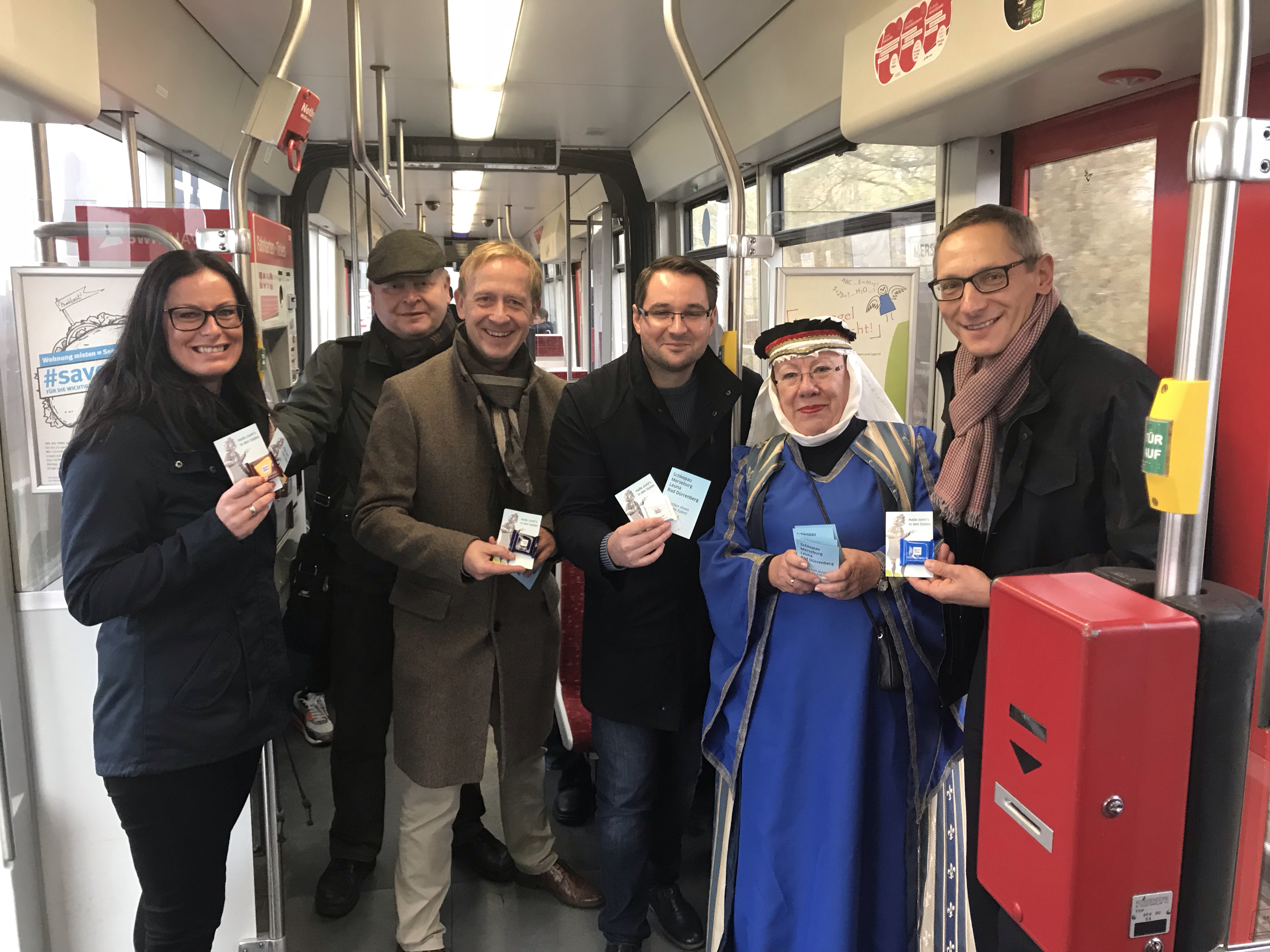 Vertreter von Halle, der HAVAG, von Schkopau, Merseburg, Leuna und Bad Dürrenberg werben gemeinsam für die Straßenbahnlinie Nr. 5.