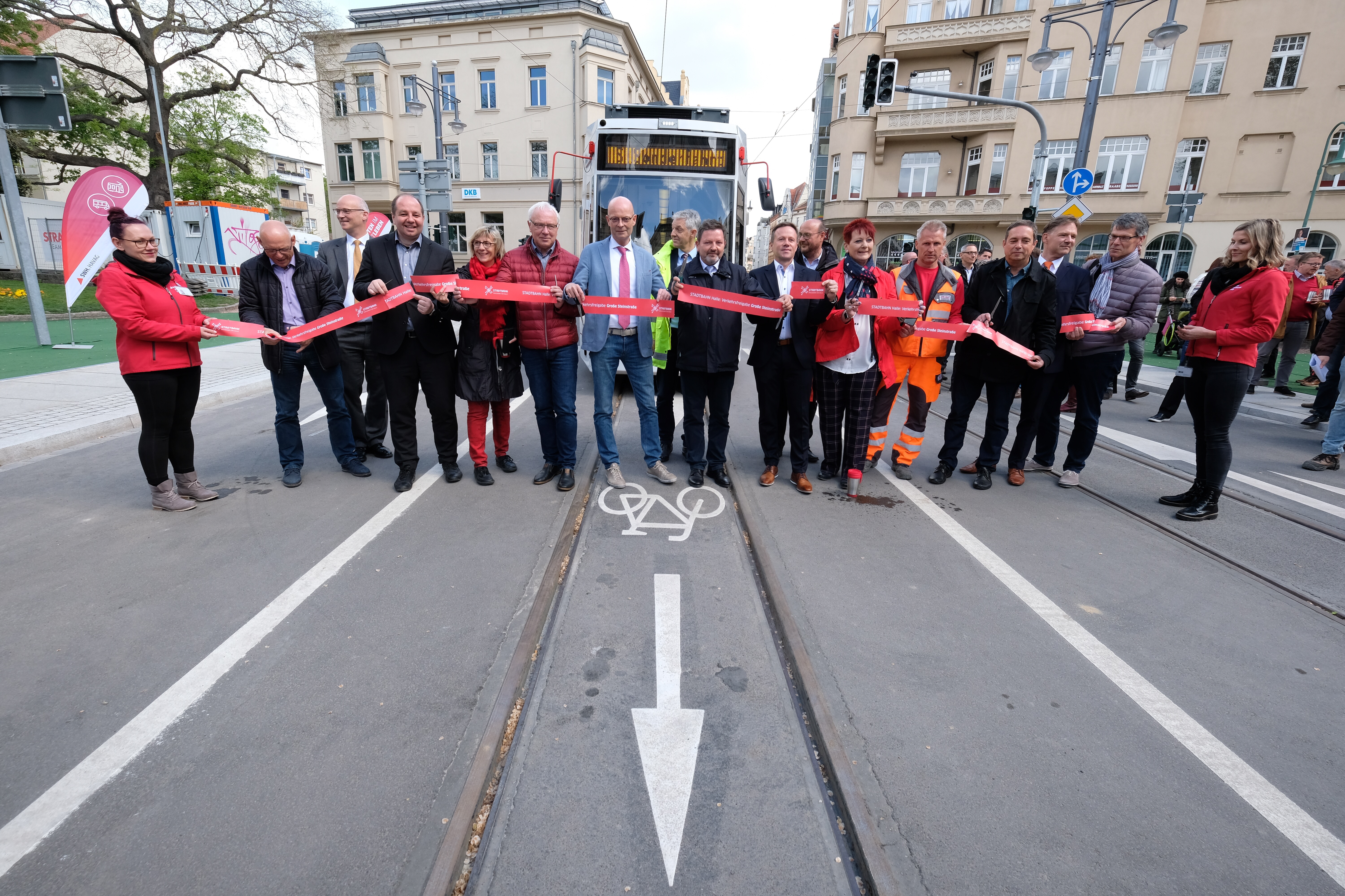 Die Fertigstellung der Baumaßnahme Große Steinstraße als eines der wichtigsten Vorhaben im Programm STADTBAHN Halle wird heute mit einem Festakt von der Stadt Halle, den Stadtwerken Halle, der Halleschen Verkehrs-AG und vielen Gästen feierlich begangen. Mit einem Banddurchschnitt wird die Strecke offiziell eröffnet, bevor es dann auf eine Jungfernfahrt durch die neugestaltete Einkaufsmeile geht. Der Straßenbahnverkehr selbst wird dann am Montag, 6. Mai, aufgenommen. Mit der Beendigung der ambitionierten Baustelle, die für Planer, Bauleute, Händler und Anwohner eine große Herausforderung darstellte, wurde im Rahmen des STADTBAHN-Projektes wieder ein Meilenstein geschafft und die Lebensqualität in Halle (Saale) verbessert.