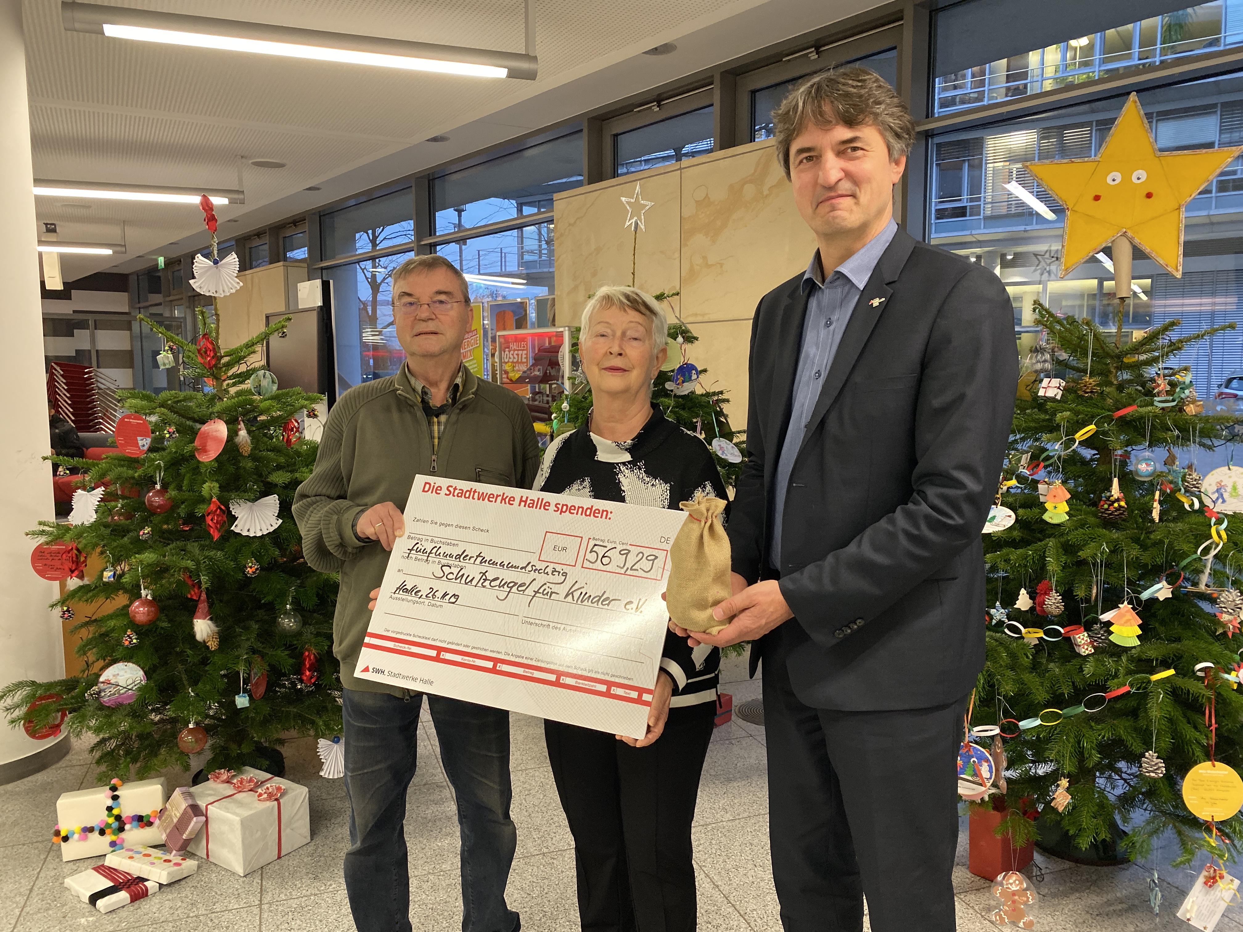 Die Stadtwerke Halle haben auf der Saale Messe im November gemeinsam mit Kundinnen und Kunden Geld für einen guten Zweck gesammelt. Insgesamt wurden 569,29 Euro für den Verein „Ein Schutzengel für Kinder“ gesammelt. Heute überreichte Matthias Lux, Vorsitzender Geschäftsführer der Stadtwerke Halle GmbH, dem Verein die Spende.