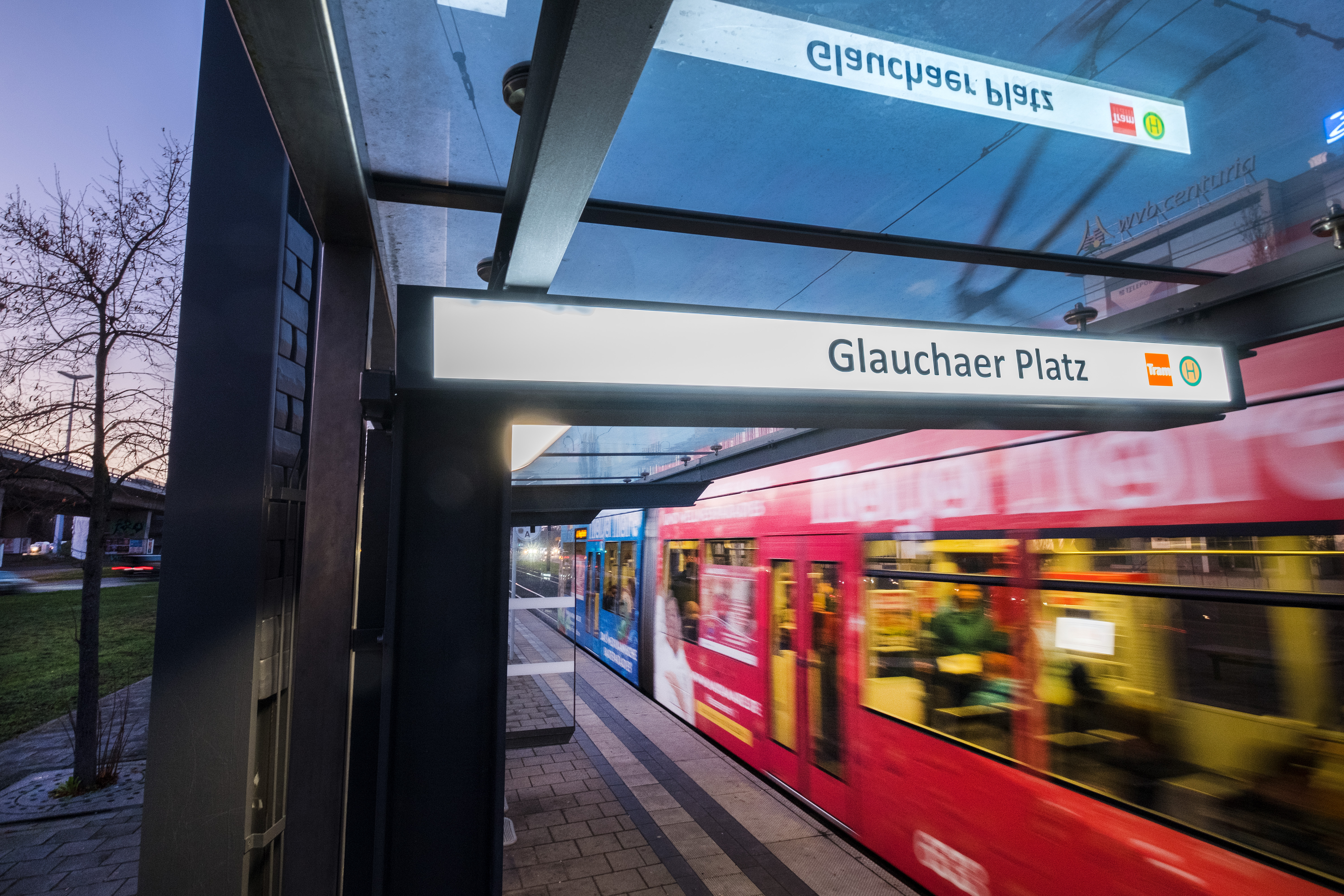 Nach und nach sollen alle Haltestellen mit beleuchteten Haltestellenschildern ausgerüstet werden, wie hier am Glauchaer Platz.