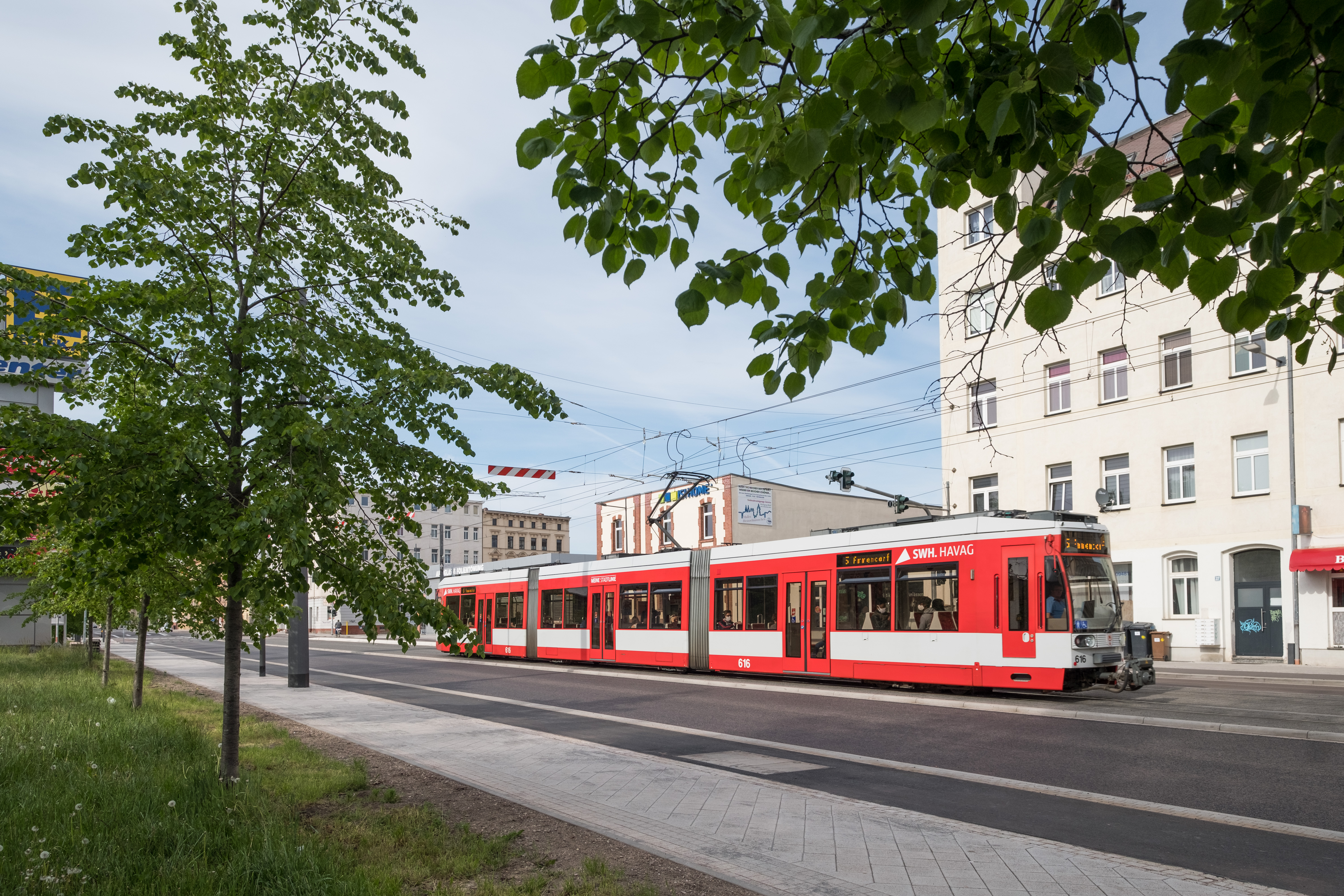 Mit der Pflanzung einer Winterlinde haben Vertreterinnen und Vertreter der Stadtwerke Halle und der Halleschen Verkehrs-AG heute in der umgebauten nördlichen Merseburger Straße ein symbolisches Zeichen für den Ausbau des umweltfreundlichen „grünen“ Stadtbahnprogramms gesetzt. Die Stadtbahn als Teil des Umweltverbundes leistet einen großen Beitrag für den Umweltschutz, nicht nur als Verkehrsträger, sondern auch beim Ausbau der innerstädtischen Verkehrsinfrastruktur. Die Merseburger Straße, die wichtigste Nord-Süd-Achse von Halle (Saale) wurde heute nach dem grundhaften Ausbau und der neuen Verkehrsführung zur B 6 in Richtung Leipzig vollständig für den Verkehr freigegeben. Das Vorhaben Ausbau Merseburger Straße ist eines der bedeutendsten Projekte innerhalb des Programms STADTBAHN Halle zur nachhaltigen Verbesserung der ÖPNV-Infrastruktur. Maßnahmenträgerin ist die Hallesche Verkehrs-AG als Tochter der Stadtwerke Halle.
