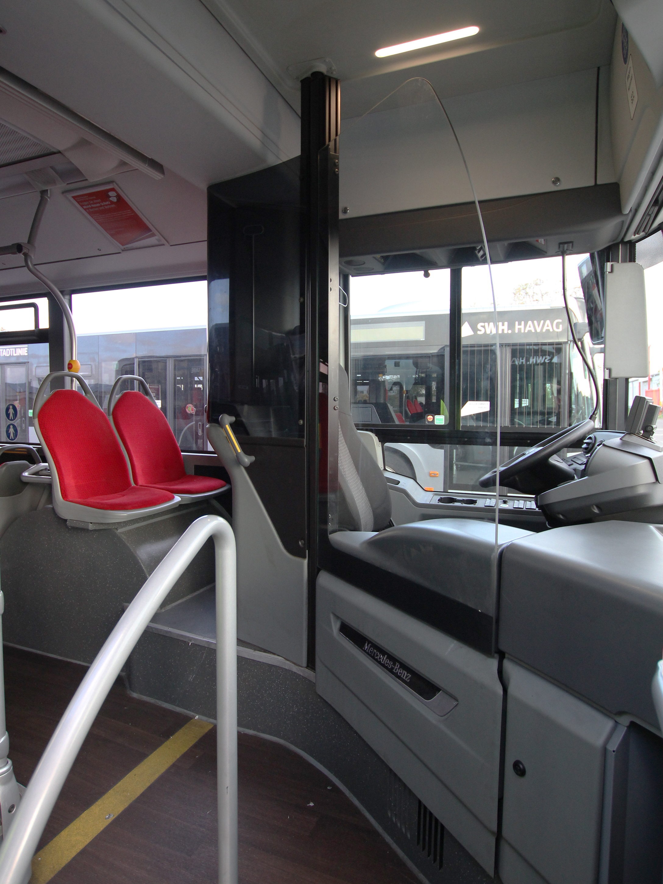 Seit Freitag, 30. Oktober 2020, ist der erste Bus der Halleschen Verkehrs-AG, ein Unternehmen der Stadtwerke Halle-Gruppe, mit einer vergrößerten Kabinentürscheibe im Einsatz. Diese Türen dienen dem Pandemieschutz der Fahrerinnen und Fahrer und werden schrittweise in den meisten Bussen eingebaut. Zeitgleich werden die bisher genutzten mobilen Trennwände und Sperrketten zwischen Fahrer*innenarbeitsplatz und Fahrgastraum abgebaut und die erste Bustür steht den Fahrgästen nach dem Umbau auch wieder zum Einsteigen zur Verfügung.