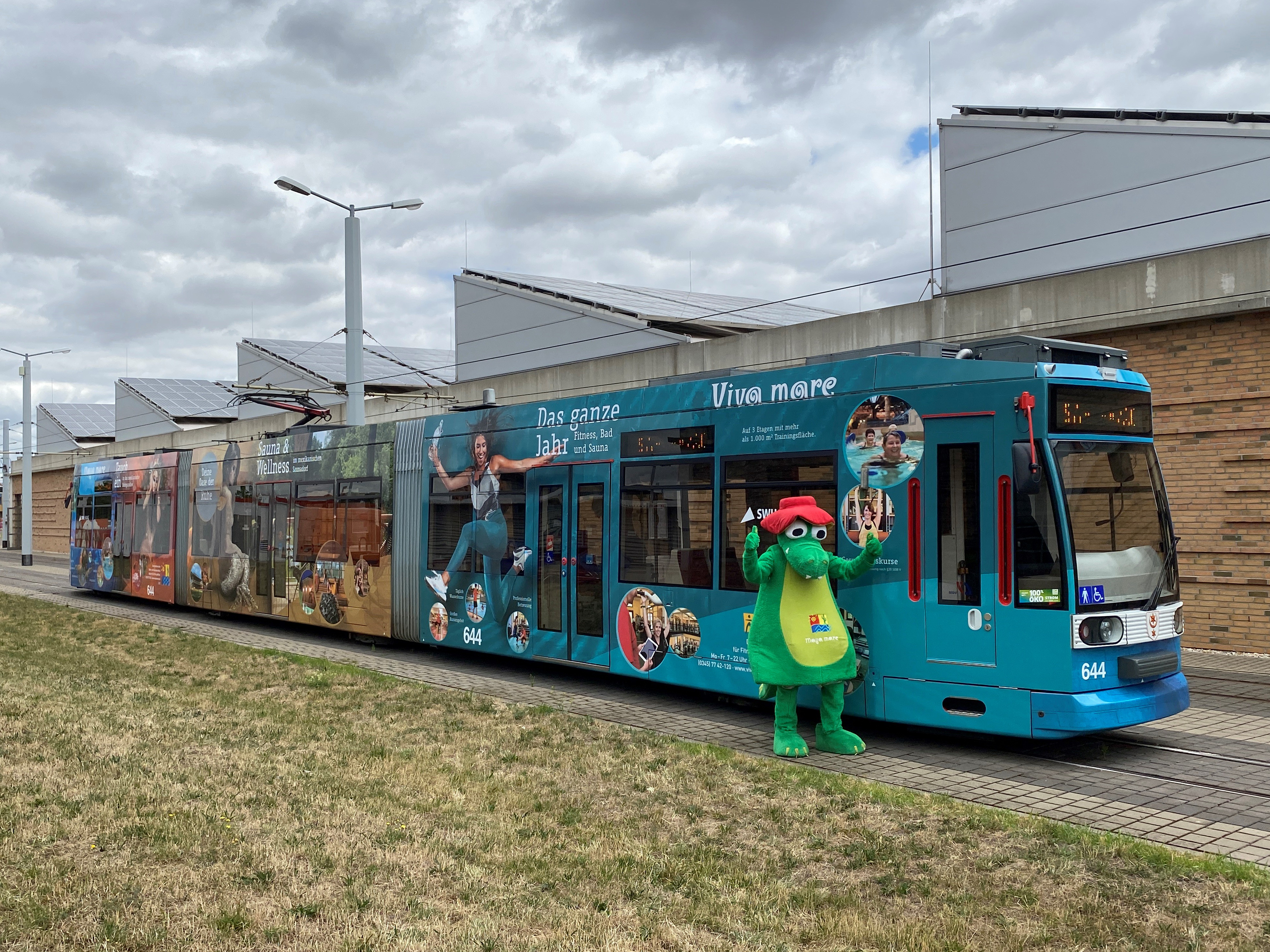 Bereits seit 2008 dreht die Maya mare-Straßenbahn ihre Runden durch die Saalestadt. Das Design war jedoch verblasst und auch veraltet, sodass es höchste Zeit für einen frischen Anstrich war. Drei Wagons bilden nun jeweils einen der drei Bereiche des Maya mare ab: Badeparadies, Sauna & Wellness sowie Fitness.