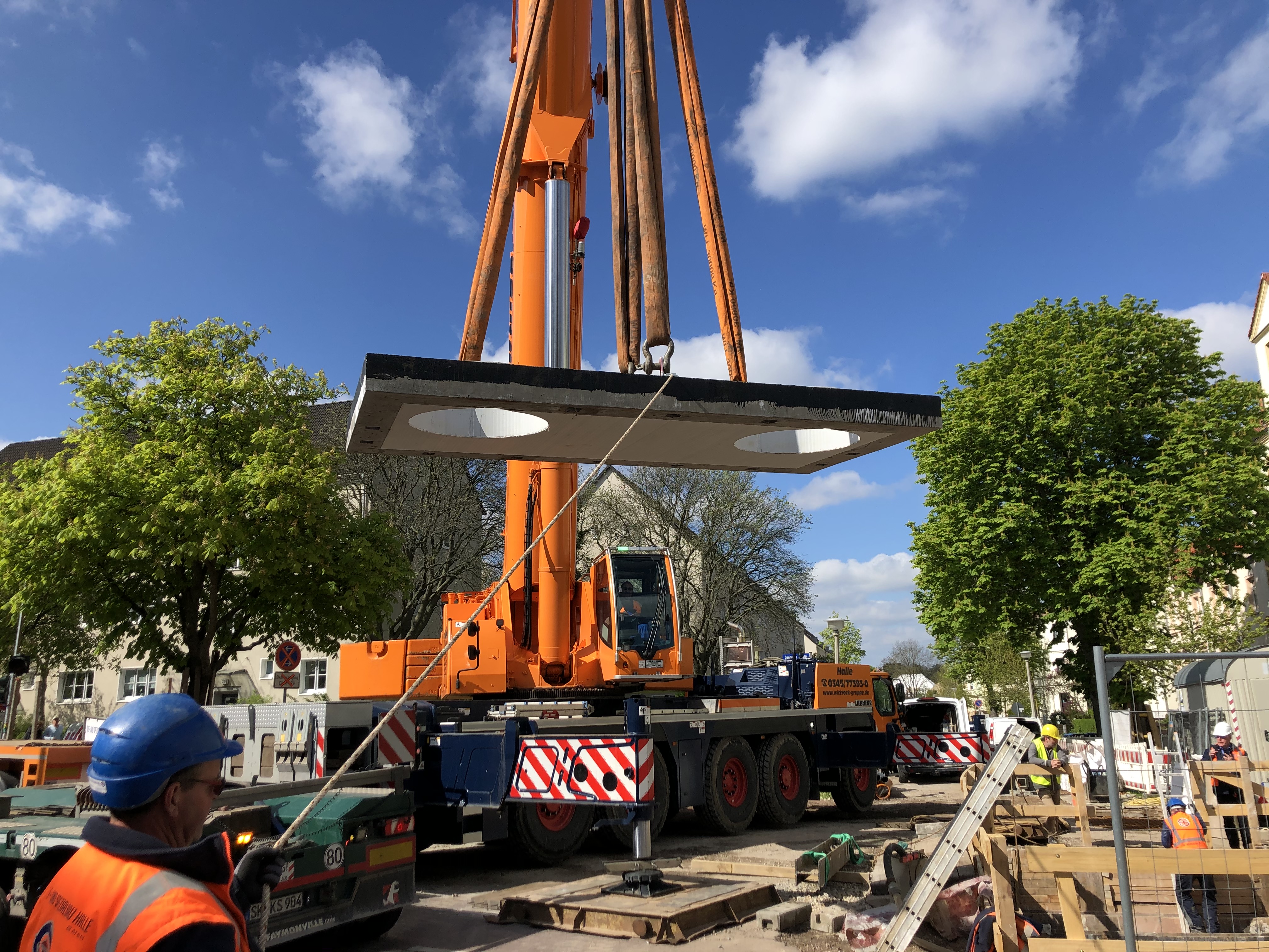 Seit November 2022 erneuert die HWS die sanierungsbedürftige Abwasserinfrastruktur im Umfeld der Mötzlicher Straße und Seebener Straße auf einer Gesamtlänge von etwa 520 Metern. In diesem Zusammenhang wird am Mittwoch, 31. Mai 2023, erneut ein werkseitig hergestelltes Sonderbauwerk mithilfe eines Schwerlasttransportes auf die Baustelle geliefert und eingebaut.