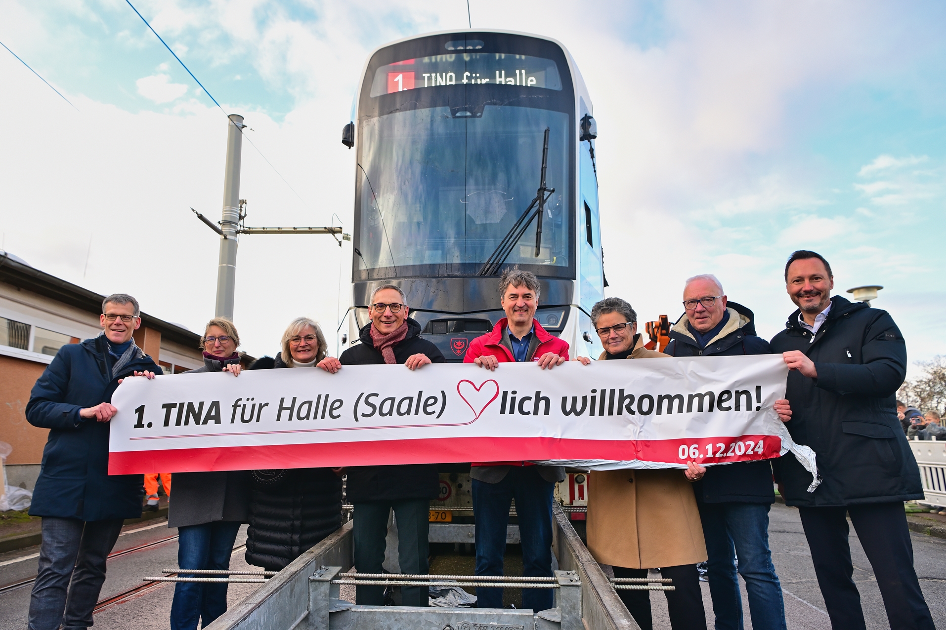 Im Beisein von Dr. Lydia Hüskens, Ministerin für Infrastruktur und Digitales Sachsen–Anhalt, freut sich HAVAG-Vorstand Vinzenz Schwarz bei der Ankunft der ersten TINA: „Ein großer Tag für die Fahrgäste der Halleschen Verkehrs-AG und die Stadt Halle (Saale)! Heute feiern wir nicht nur die Ankunft der ersten TINA, sondern auch den Beginn einer neuen Reise für die Stadt! Diese innovative Straßenbahn symbolisiert unseren Mut, die Zukunft zu gestalten – eine Zukunft, die für alle zugänglich, umweltfreundlich und voller Möglichkeiten ist. Die neuen Bahnen treiben die Verkehrswende in Halle (Saale) weiter voran. Wir freuen uns, unseren Fahrgästen ab 2025 noch mehr Service, Komfort, Platz und Sicherheit bieten zu können. Ein auch im Sommer klimatisierter und hellerer Fahrgastraum, größere Türbreiten, keine Stufen im gesamten Fahrzeug, breitere Gänge, verbesserte Haltemöglichkeiten, moderne Informationssysteme und innovative Fahrerassistenzsysteme, u.a. zur Kollisionsvermeidung, zeichnen unsere neuen Bahnen aus.“