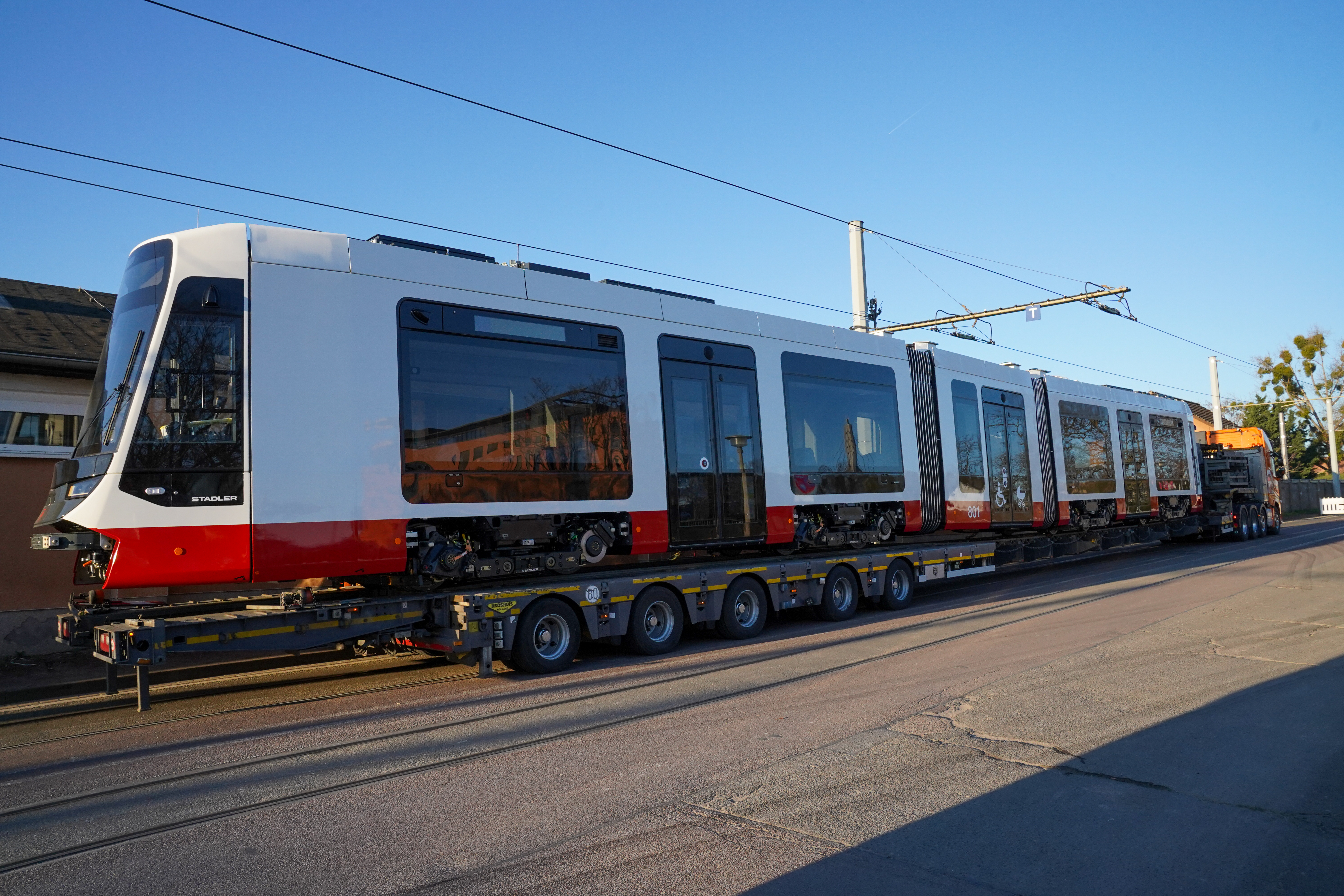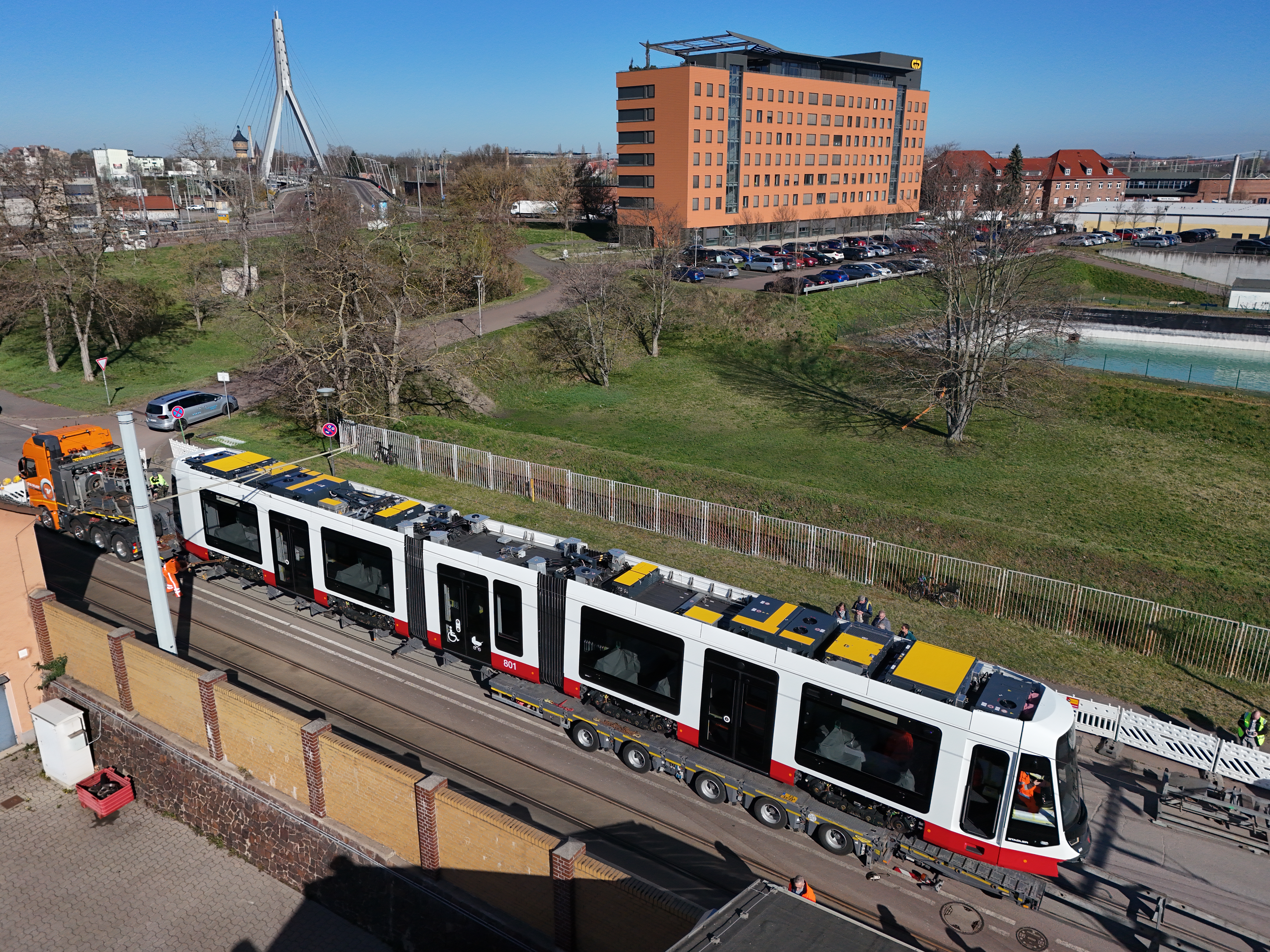 Heute ist die erste „kurze“ Straßenbahn der neuen TINA-Generation (Total Integrierter Niederflurantrieb) bei der Halleschen Verkehrs-AG (HAVAG), einem Unternehmen der Stadtwerke Halle, eingetroffen und vom Tieflader in den Betriebshof Freiimfelder Straße gerollt. Damit sind dann insgesamt bereits vier von 56 Bahnen in der Saalestadt. Mit 30 Metern Fahrzeuglänge ist die Bahn so lang wie die bisherigen MGT6D-Züge, die noch im Einsatz sind. Die neuen Bahnen bieten Platz für 167 Fahrgäste, 64 davon auf Sitzplätzen. Bisher sind bereits drei 45 Meter-XL-Varianten der TINA angekommen.