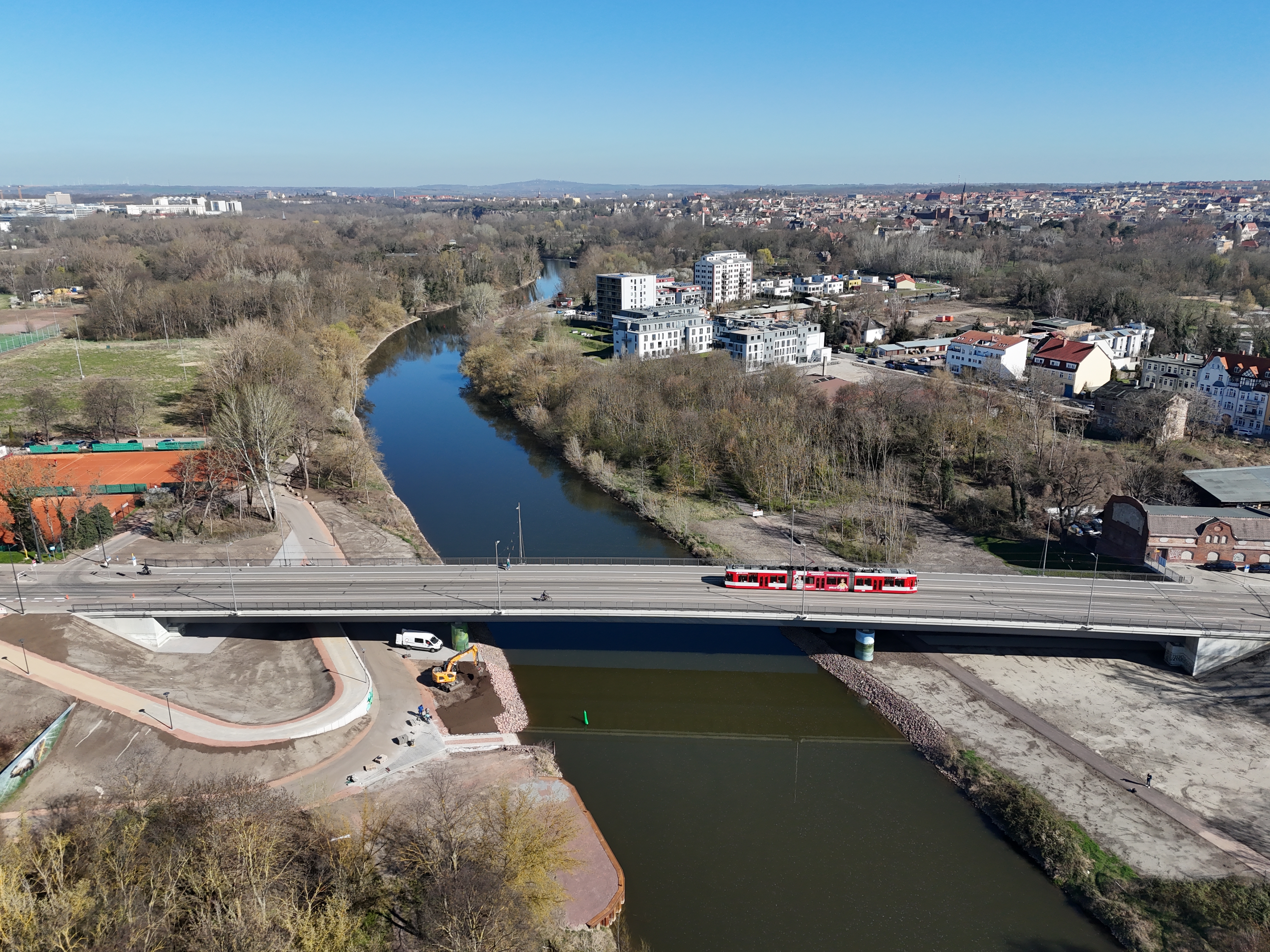 Das STADTBAHN-Projekt Mansfelder Straße der Halleschen Verkehrs-AG, einem Unternehmen der Stadtwerke-Halle-Gruppe, neigt sich nun erfolgreich dem Ende zu. Nach intensiven Bauarbeiten, inklusive Neubau der neuen Elisabethbrücke, dem Abriss der alten flutgeschädigten Elisabethbrücke und der Fertigstellung der Nebenanlagen sind nun alle Arbeiten abgeschlossen. In der finalen Phase wurde noch ein barrierefreier Weg von der Mansfelder Straße hinunter zur Saale unter der neuen Elisabethbrücke gebaut, der nun die Verbindung von der Mansfelder Straße in oder aus Richtung Peißnitz wieder ermöglicht. Die Rampe wird nach der Montage des Geländers für den Verkehr im Mai freigegeben. Abschließend werden im Herbst noch Bäume an der Mansfelder Straße und auf Ausgleichsflächen am Hufeisensee gepflanzt. Der Parkplatz am Kaufhaus Lührmann, der während der Bauzeit als Baustelleneinrichtungsfläche genutzt wurde, wird nun in den kommenden Tagen wieder freigegeben. Auf dem Parkplatz finden noch Markierungsarbeiten durch die Stadt Halle (Saale) statt. Erst kürzlich hat die neue Elisabethbrücke eine Auszeichnung erhalten, weil diese modern, nachhaltig und effizient gebaut wurde. Ein großer Dank gilt allen am Bau Beteiligten, anliegenden Geschäften und Anwohnenden für die erfolgreiche Bauzeit.