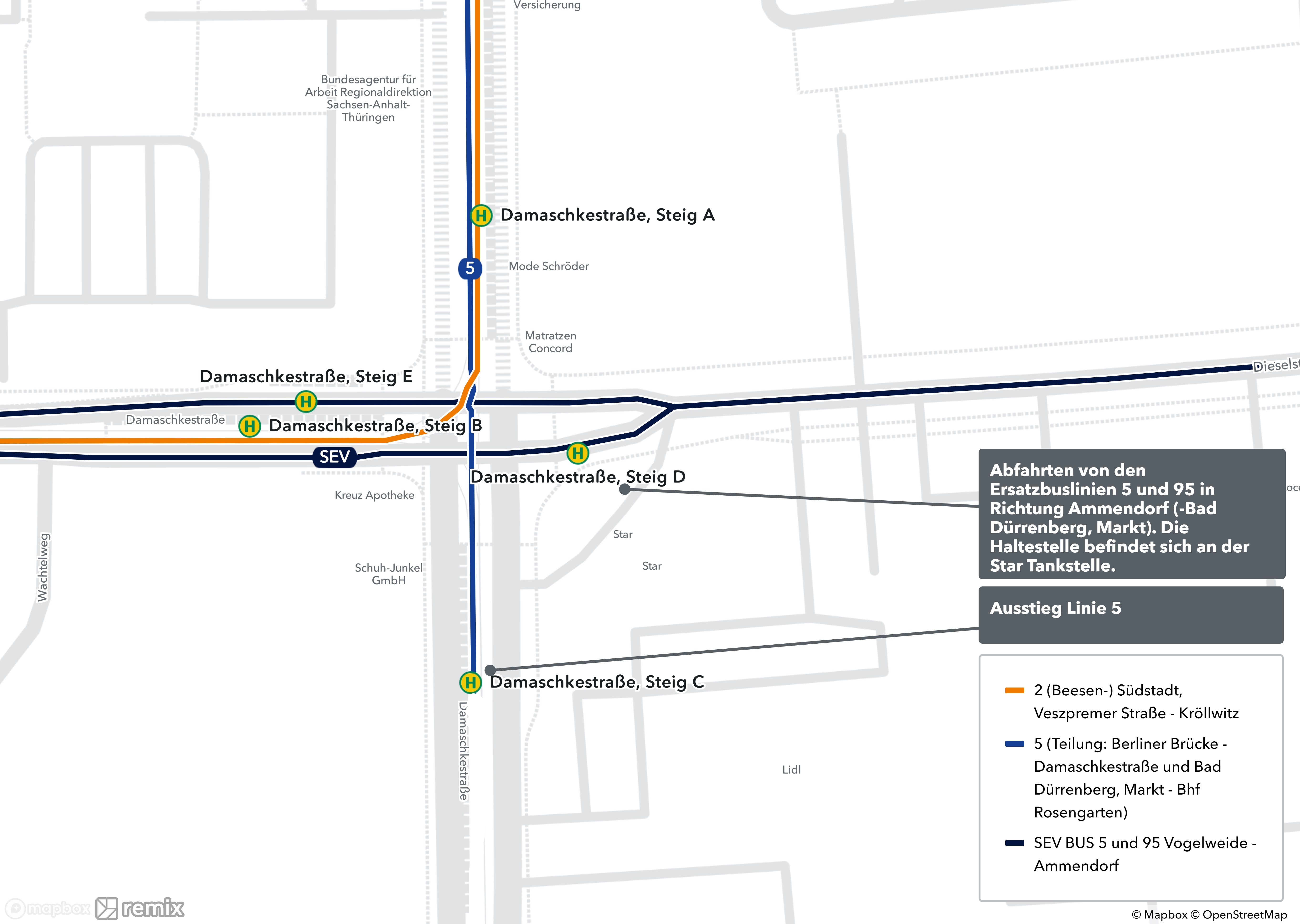 Als Ersatz für die Linien 5 und 95 fahren die Ersatzbuslinien 5 und 95 im Tages-, Spät- und Nachtverkehr zwischen den Haltestellen Vogelweide, Damaschkestraße und Ammendorf.