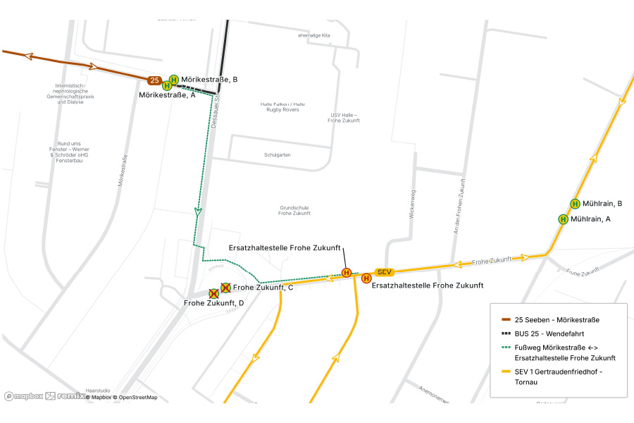 Die Buslinie 25 verkehrt während der Bauzeit verkürzt zwischen Seeben über Trotha bis zur Haltestelle Mörikestraße (Zugang zur Grundschule Frohe Zukunft). Für Fahrgäste mit Zielen Tornau, Mötzlich oder Gertraudenfriedhof steht die Weiterfahrt mit der Ersatzverkehrslinie SEV 1 ab der Ersatzhaltestelle Frohe Zukunft/Ecke Krokusweg zur Verfügung.